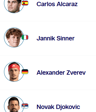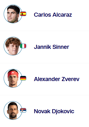 Column 4: Current game points - Sinner has 0 points (Love), Alcaraz has 5 games in the set (this appears to be showing set games)